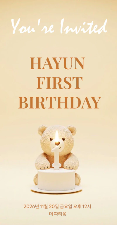 스냅포스트의 비디오 돌잔치 초대장은 정적인 사진 나열에서 벗어나, 생동감 넘치는 영상 히어로 섹션으로 하객들에게 깊은 인상을 남깁니다. 곰과 케이크, 따스한 촛불이 담긴 스토리 영상은 아기의 첫 번째 생일이 갖는 소중한 의미를 전달하며, 그 위에 오버레이된 영문 타이포그래피는 감각적인 분위기를 연출합니다. 모바일 풀스크린에 최적화된 영상은 1회 재생 후 자연스럽게 정지되어 하객의 데이터를 보호하는 기술적 세심함까지 갖췄습니다. 사진을 고르는 번거로움 없이 오직 영상 하나로 완성되는 이 특별한 템플릿은 시간이 부족한 부모님들에게 가장 합리적인 선택이 될 것입니다.