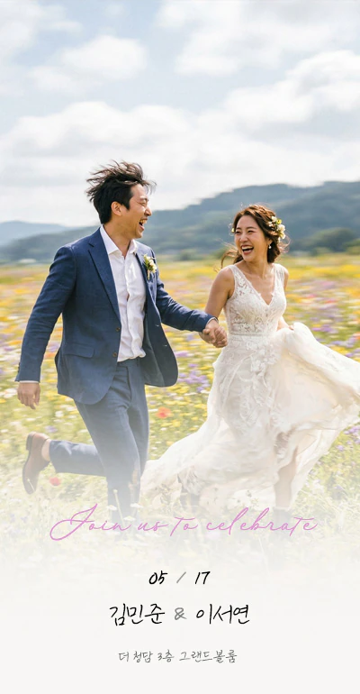 신랑·신부의 진심이 담긴 초대 인사말. 본문 텍스트, 폰트 스타일, 정렬 방식을 커스터마이징하여 나만의 감성을 전달할 수 있습니다.