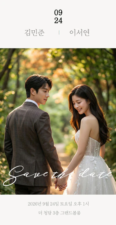 신랑·신부의 진심이 담긴 초대 인사말. 본문 텍스트, 폰트 스타일, 정렬 방식을 커스터마이징하여 나만의 감성을 전달할 수 있습니다.