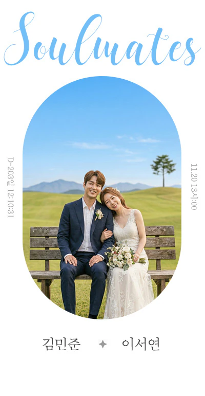 단 한 장의 사진이 주는 진한 여운, 그리고 매 순간 흐르는 사랑의 기록을 담았습니다. **격조 있는 오벌 프레임과 예술적인 스크립트** 부드러운 곡선의 타원형 프레임은 신랑 신부의 가장 아름다운 인물 사진을 갤러리에 전시된 작품처럼 연출합니다. 사진 위를 흐르는 파스텔 블루와 핑크 톤의 영문 손글씨 타이틀(SVG)은 정형화되지 않은 로맨틱한 감성을 자아내며, 화이트와 베이지 톤의 미니멀한 배경은 시각적 편안함을 제공합니다. **실시간으로 전해지는 예식의 설렘** 좌측에 배치된 실시간 카운트다운은 예식까지 남은 시간을 초 단위로 생생하게 보여줍니다. 단순히 날짜를 알리는 것을 넘어, 하객들과 함께 그 소중한 순간을 향해 달려가는 기대감을 공유합니다. 매초 갱신되는 숫자는 두 사람이 함께할 미래를 향한 약속의 증표입니다. **세심한 배려를 담은 미니멀 레이아웃** 우측 수직 정렬로 배치된 예식 일시와 하단 이름 사이의 4점 별 구분자는 미니멀 디자인의 정수를 보여줍니다. 복잡한 요소는 덜어내고, 신랑 신부의 이름과 하객을 위한 정보만을 정갈하게 배치하여 읽는 이의 마음까지 따뜻하게 만듭니다.